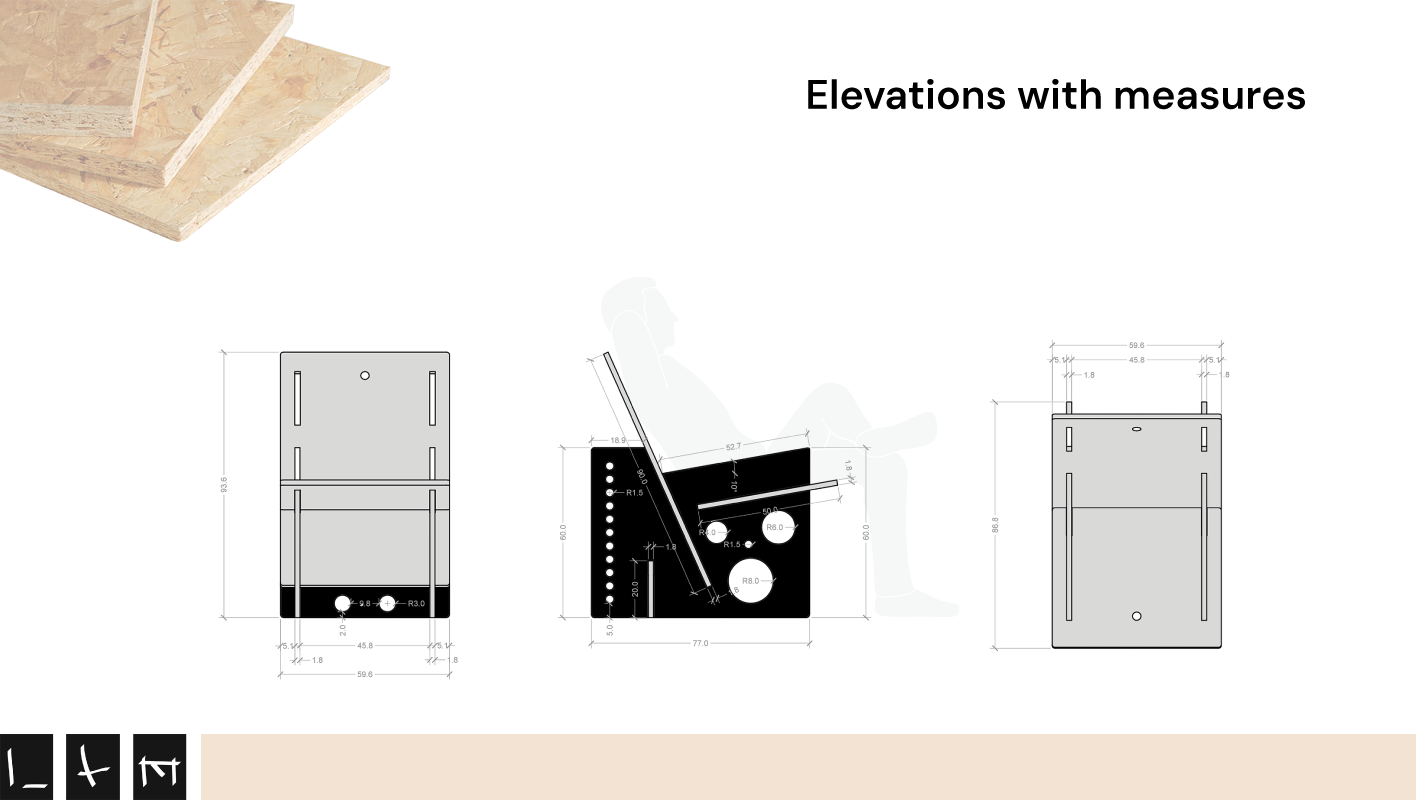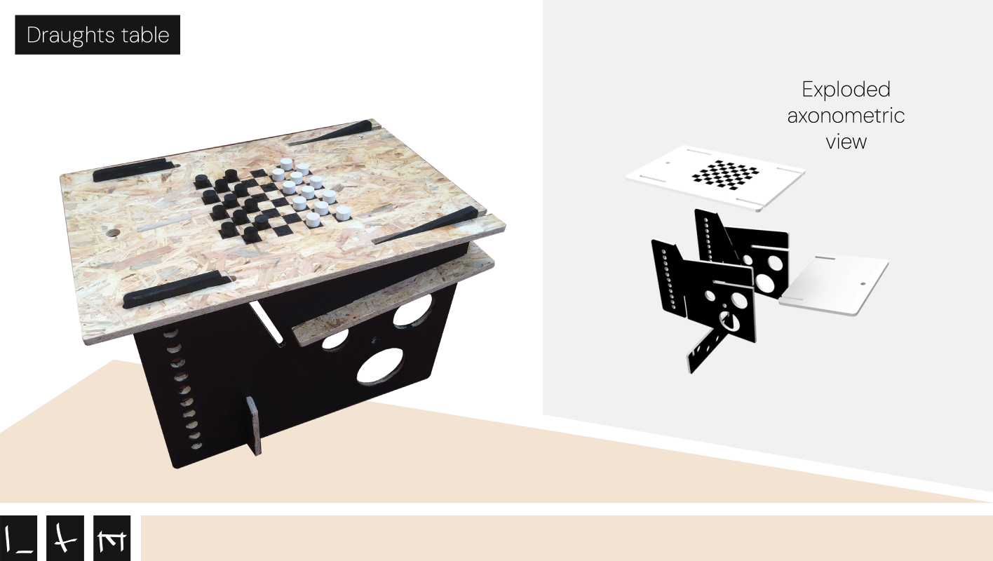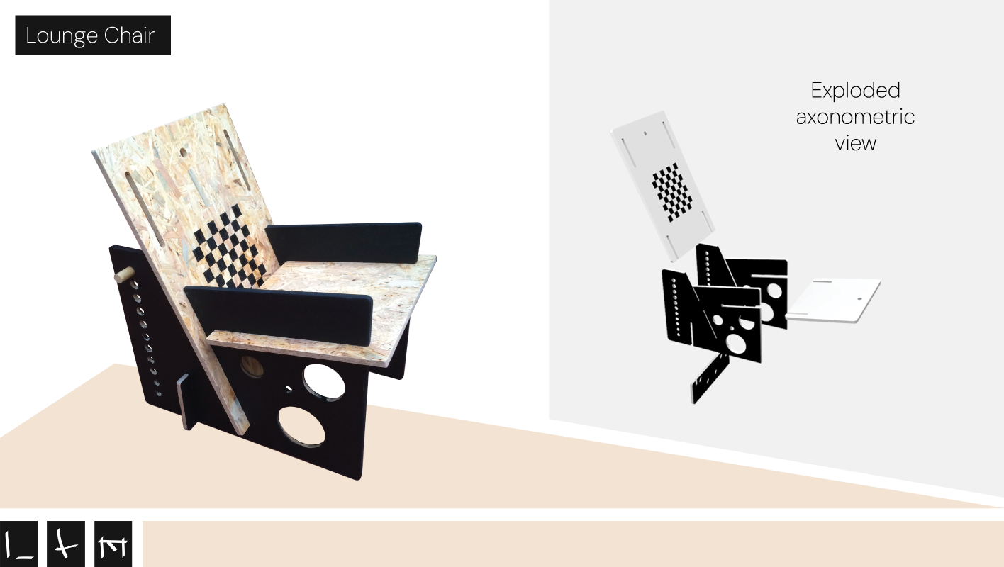 LXM originated from a design competition aimed at repurposing OSB wood planks, a waste material often used as cladding, roofing and site fencing, into multifunctional furniture. The result is a chair, blackboard, and coffee table with an integrated draughts table. The result is a furniture element designed without the use of glue, nails, or additional tools. This approach ensures adaptability and effortless assembly, making LXM a highly versatile and intuitive design. The acronym LXM stands for the graphical representation of the three functions, according to the section of each module: L for the chair, X for the blackboard and M for the table.